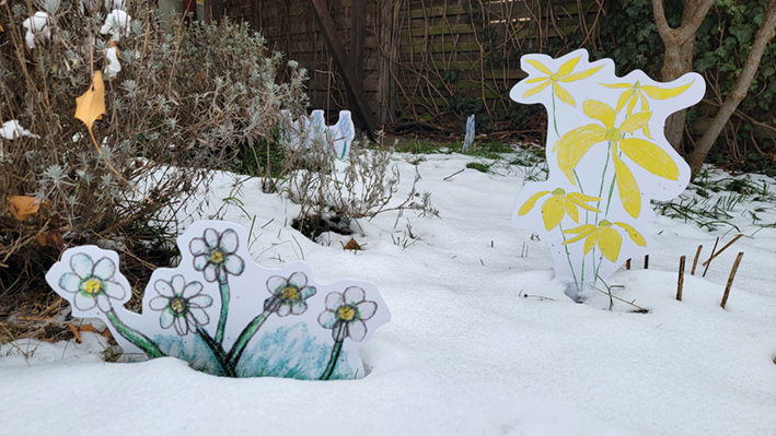 In Vorbereitung der Ausstellung fanden im Frühjahr und Sommer 2025 im LesArt-Garten von Sonja Danowski betreute Zeichenworkshops statt. Ausgewählte Ergebnisse der kleinen und großen Künstlerinnen und Künstler schmückten dann den Winter über den Garten und zeigten, welche Blumen schon auf den Frühling warteten.